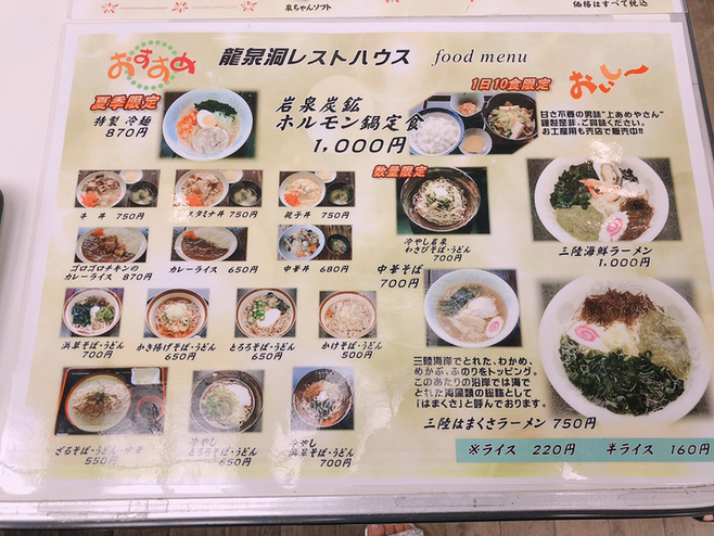 和室8畳間 ¥7,700 ~ 和室6畳間 ¥8,030 ~ 19年1月10日~22年2月28日 一泊夕食付き☆ビジネスプラン 仕事で朝が早いお客様にお勧めのプランです。 1500~00 龍泉洞で食事はできる? 龍泉洞の鍾乳洞から出ると、近くに食事ができるお店があります。 そこで私たちも、ちょっと遅い昼食をいただきました。 ラーメンとかカレーとか、ホットドックを食べました。Go To Eatキャンペーン開催中日本最大級のグルメサイト「食べログ」では、龍泉洞・龍泉新洞科学館周辺で人気のお店 34件を掲載中。実際にお店で食事をしたユーザーの口コミ、写真、評価など食べログにしかない情報が満載。ランチでもディナーでも、失敗しないみんながおすすめするお店